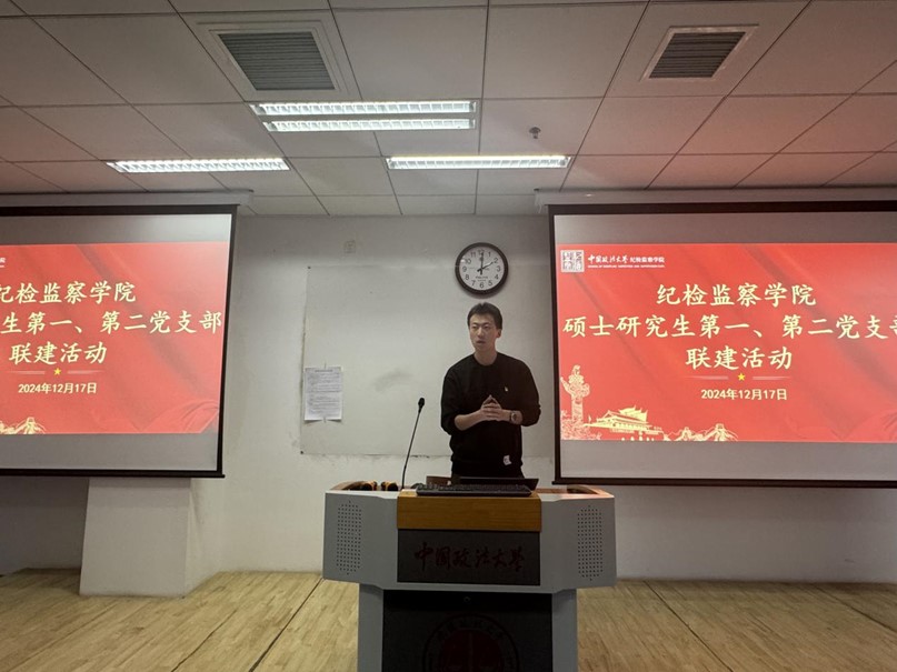 为深入学习贯彻落实党的二十届三中全会精神和全国教育大会精神,提升党员的政治站位、增强党员的政治素养,促进学院支部间交流互动,打造具有纪检监察学科特色的支部活动,12月17日下午,学院硕士研究生第一、第二党支部在图书综合楼0522教室开展以“党的自我革命与人民监督”为主题的联学共建活动,本次活动由硕士研究生第一党支部书记薛琪洪主持,学院专任教师徐轶超、李作、杨恩泰三位老师出席。